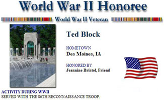 | Ted was a member of North High's class of June, 1942. His next of kin were listed as Mr. and Mrs. David Block who lived at 219 College Avenue, Des Moines, IA. Ted's service number was 37658989. | ||||||||||||||||||||||||||||||||||||||||||||||||||||||||||||||||||||||||||||||||||||||||||||||||||||||||||||||||