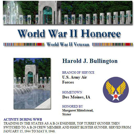 High School Wall of Honor Harold James Bullington Class of June, 1943 |