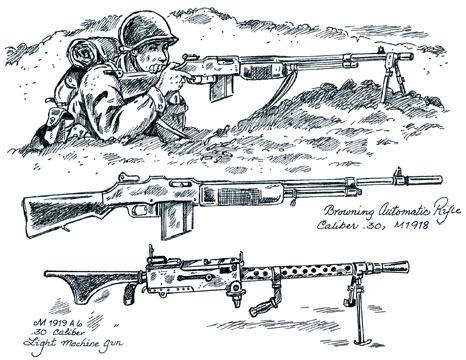 George M. Randall (AP-115) Korean War As an MSTS ship, USS General George M. Randall made scheduled runs between the West coast of the United States and the Orient until fighting erupted in Korea in the summer of 1950. She participated in the amphibious assault at Inchon which routed the North Korean Army and forced Communist evacuation of South Korea. After hordes of Chinese Communist troops poured into Korea and trapped American forces, she served in the evacuation of Hungnam, which saved the embattled G.I.'s enabling them to return to the fight. She moored at New York, New York, on 26 May 1951, and made four voyages from New York to Bremerhaven and Southampton before returning to the Pacific. On 11 March 1951, General George M. Randall departed Yokohama, Japan, with the bodies of 52 men, the first Korean War dead to be returned to the United States, including Major General Bryant E. Moore, who had commanded the IX Corps. Armed Services honor guards were in attendance at the departure, as was an Army Band, and was heavily covered by the press. The ship arrived at San Francisco, also carrying 1500 officers and men of the 1st Marine Division being rotated home for 30 day leave. She then returned to Yokohama on 24 October. ***1st Marine Division(From the 1st Marine Division Presidential Unit Citation Award) The President of the United States takes pleasure in presenting The Presidential Unit Citation to the First Marine Division Reinforced for services as set forth in the following citation: "For extraordinary heroism in action against the enemy aggressor forces in Korea during the periods 21 to 26 April, 16 May to 30 June, and 11 to 25 September, 1951. Spearheading the first counteroffensive in the spring of 1951, the First Marine Division, Reinforced, engaged the enemy in the mountainous center of Korea in a brilliant series of actions unparalleled in the history of the Marine Corps, destroying and routing hostile forces with an unrelenting drive of seventy miles north from Wonju. During the period 21 to 26 April, the full force of the enemy counteroffensive was met by the Division, north of the Hwachon Reservoir. Although major units flanking The Marine Division were destroyed or driven back by the force of this attack, the Division held firm against the attackers, repelling the onslaught from three directions and preventing the encirclement of the key center of the lines. Following a rapid regrouping of friendly forces in close contact with the enemy, the First Marine Division, Reinforced, was committed into the flanks of the massive enemy penetration and, from 16 May to 30 June, was locked in violent and crucial battle which resulted in the enemy being driven back to the north with disastrous losses to his forces in the number of killed, wounded, and captured. Carrying out a series of devastating assaults, the Division succeeded in reducing the enemy's main fortified complex dominating the 38th Parallel. In the first significant offensive of the action in Korea, from 11 to 25 September 1951, the First Marine Division, Reinforced, completed the destruction of the enemy forces in Eastern Korea by advancing the front against a final desperate enemy defense in the "Punch Bowl" area in heavy action which completed the liberation of South Korea in this locality. With the enemy's major defenses reduced, his forces on the central front decimated, and the advantage of terrain and the tactical initiative passing to friendly forces, he never again recovered sufficiently to resume the offensive in Korea. The outstanding courage, resourcefulness, and aggressive fighting spirit of the officers and men of the First Marine Division, Reinforced, reflect the highest credit upon themselves and the United States Naval Service." (From the 1st Marine Division Presidential Unit Citation Award) The President of the Republic of Korea takes profound pleasure in citing for outstanding and superior performance of duty during the period 26 October to 27 July 1953 the First United States Marine Division Reinforced for the award of President Unit Citation: "Landing at Wonsan on 26 October 1950 the First United States Marine Division (Reinforced) advanced to Yudam-ni where they engaged the Chinese Communist Forces. The heroic and courageous fighting of the First United States Marine Division (Reinforced), which was outnumbered but never outfought by the Chinese Communist Forces; coupled with its fight against the terrible winter weather in this return to Hungnam, has added another glorious page to the brilliant history of the United States Marines. After regrouping and retraining, the First United States Marine Division (Reinforced) rejoined the United Nations Forces and began the attack to the north which drove the aggressors relentlessly before them. The enemy spring offensive during April 1951 which threatened to nullify the recent United Nations gains was successfully repulsed by the First Marine Division (Reinforced) and when other Republic of Korea Forces were heavily pressed and fighting for survival the timely offensive by this Division gave heart to the people of Korea." ****Browning Automatic Rifle (BAR) WWI saw the first use of automatic weapons on a large scale. The Model 1918 Browning Automatic Rifle, known as the BAR, was created by arms designer John Browning to be a light automatic weapon which could be fired from the shoulder or hip. The weapon saw service with the American forces during the last stages of WWI, where it provided "walking fire" for attacks on enemy positions. It fired a standard .30 caliber rifle cartridge that was valued for its range and penetrating power. Between the World Wars, several variations on the basic design were made, including the addition of a folding bipod. The BAR was used extensively in WWII where it became an essential weapon in the American rifle squad. During the Korean War, the BAR again saw active service in all major campaigns. Its accurate automatic fire too