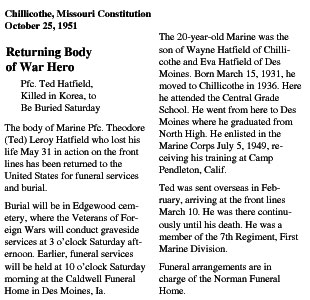 Ted graduated in the June, 1949 North High class. He enlisted in the US Marine Corps on July 5, 1949 in Des Moines, IA. His service number was 1100567. Ted's next of kin was listed as Mrs. Eva May Morlan Hatfield, 516 12th Street, Des Moines, IA. |