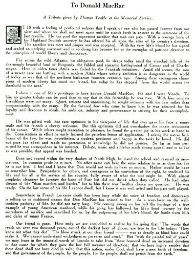 | Research done by Rick Nehrling, Class of 1963 and Claradell Shedd, Class of 1953. Eulogy given for Corporal Donald H. MacRae by a friend, Thomas Tenkle. | ||||||||||||||||||||||||