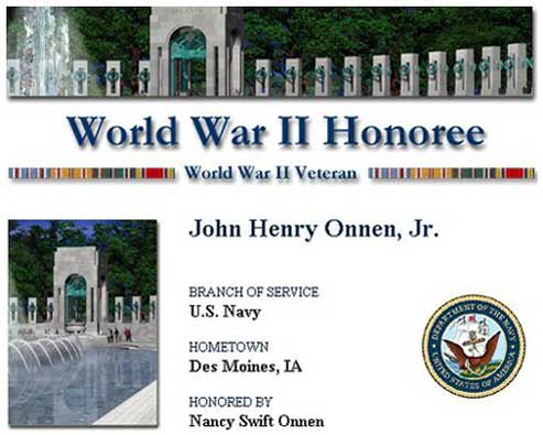 High School Wall of Honor John Henry Onnen, Jr. Class of January, 1944 |