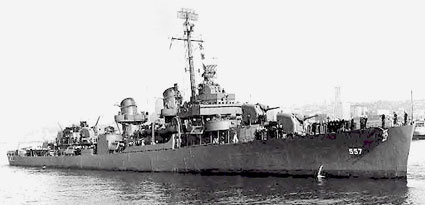 Johnston (DD-557) USS Johnston (DD-557) was a World War II-era Fletcher-class destroyer in the service of the United States Navy. She was the first Navy ship named after Lieutenant John V. Johnston. The ship was most famous for its bold action in the Battle off Samar. The small "tincan" destroyer armed with nothing larger than 5" guns and torpedoes would lead the attack of a handful of light ships which had inadvertently been left unprotected in the path of a massive Japanese fleet led by battleships and cruisers. The sacrifices of Johnston and her little escort carrier task unit "Taffy 3" had stopped Admiral Kurita's powerful Center Force in the Battle off Samar from attacking vulnerable US landing forces, and inflicted greater losses than they suffered. During the Marshall Islands campaign, Johnston bombarded the beaches at Kwajalein 1 February 1944, and made a 5-day bombardment of Eniwetok 1722 February. She gave direct support to invasion troops there, destroying several pillboxes and taking revetments along the beach under fire. En route to patrol duty in the Solomons 28 March 1944, she bombarded Kapingamarangi Atoll in the Carolines. An observation tower, several blockhouses, pillboxes and dugouts along the beach were shelled. Two days later she came into the mouth of the Maririca River, southeast of Empress Augusta Bay, Bougainville, Solomon Islands. After laying a heavy barrage into that area, she took up antisubmarine patrol off Bougainville. During this duty 15 May 1944, she depth charged and sank the Japanese submarine I-176. After 3 months of patrol in the Solomons, Johnston sailed to the Marshall Islands to prepare for the invasion and capture of Guam in the Marianas. On 21 July 1944, she teamed up with the Pearl Harbor "ghost", the battleship Pennsylvania, to bombard Guam. The destroyer had sent in more than 4,000 rounds of shells by 29 July. Her accurate gunfire shattered the enemy 4 inch battery installations, numerous pillboxes and buildings. Johnston next helped protect escort carriers providing air support for the invasion and capture of the Palau Islands. Now the time had come for General MacArthur's long awaited return to the Philippines. Following replenishment at Seeadler Harbor, Admiralty Islands, she sailed 12 October 1944 to help protect the escort carriers maintaining air supremacy over eastern Leyte and the Gulf, sweeping the enemy off local airfields, giving troops direct support on the landing beaches from 20 October, and even destroying vehicle transport and supply convoys on the roads of Leyte itself. Johnston was operating with "Taffy 3" (Escort Carrier Task Unit 77.4.3) comprising Rear Admiral Clifton A. F. Ziggy Sprague's flagship Fanshaw Bay, five other escort carriers, three destroyers including herself, and four destroyer-escorts. "Taffy 3" was one of the three units of Rear Admiral Thomas L. Sprague's Escort Carrier Task Group 77.4, known by their voice calls as "Taffy 1", "Taffy 2", and "Taffy 3". On the morning of 23 October 1944, American submarines detected and attacked units of the Japanese fleet coming in from the South China Sea toward the precarious Leyte beachhead. The battleship-cruiser-destroyer Southern Force was decimated as it attempted to enter Leyte Gulf via Surigao Strait the night of 24–25 October 1944. The more powerful battleship-cruiser-destroyer Center Force under Vice Admiral Takeo Kurita had been pounded by Admiral “Bull” Halsey's attack carrier planes and presumably turned back from San Bernardino Strait. Admiral Halsey then raced north with his attack carriers and heavy battleships to engage a decoy Japanese carrier–battleship task force off Cape Engano. This left Johnston and her small escort carrier task unit lonely sentinels in north Leyte Gulf, east of Samar and off San Bernardino Strait. As enemy ships fled the Battle of Surigao Strait at daybreak of 25 October 1944, the powerful Japanese Center Force slipped through San Bernardino Strait and into Leyte Gulf. It steamed along the coast of Samar directly for Johnston’s little task unit and the American invasion beachhead at Leyte, hoping to destroy amphibious shipping and American troops on shore. One of the pilots flying patrol after dawn alert of 25 October 1944 reported the approach of Japanese Center Force. Steaming straight for "Taffy 3" were four battleships (including Yamato), seven cruisers, and at least 12 destroyers. Johnston's gunnery officer, Lieutenant Robert C. Hagen, later reported, "We felt like little David without a slingshot." In less than a minute, Johnston was zigzagging between the six escort carriers and the Japanese fleet and putting out a smoke screen over a 2,500-yard front to conceal the carriers from the enemy gunners: "Even as we began laying smoke, the Japanese started lobbing shells at us and the Johnston had to zigzag between the splashes.... We were the first destroyer to make smoke, the first to start firing, the first to launch a torpedo attack...." For the first 20 minutes, Johnston could not return fire as the enemy cruisers and battleships' heavy guns outranged the Johnston's 5-inch guns. Not waiting for orders, Commander Evans broke formation, and went on the offensive by ordering Johnston to speed directly towards the enemy—first a line of seven destroyers, next one light and three heavy cruisers, then the four battleships. To the east appeared three other cruisers and several destroyers. As soon as range closed to within ten miles, Johnston fired on the nearest vessel, Kumano, scoring damaging hits. In five furious minutes, Johnston fired over 200 rounds at the enemy, then, under the direction of torpedo officer Lieutenant Jack K. Bechdel, made a torpedo attack. She got off ten torpedoes, then turned to retire behind a heavy smoke screen. When she came out of the smoke a minute later, Kumano could be seen burning furiously from a torpedo hit; her bow had been blown completely off, and she was forced to withdraw. Aroun